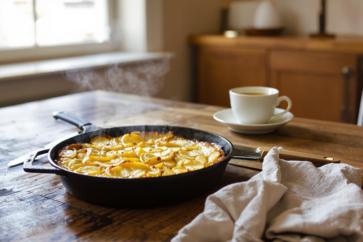 Ce n’est pas un rêve. Ce gâteau fondant aux pommes ne nécessite ni moule, ni four. Il suffit d’une simple poêle, d’un couvercle et de 15 petites minutes devant toi. Et le résultat ? Une texture tendre à cœur, légèrement caramélisée en dessous, avec le parfum réconfortant des pommes et de la vanille.