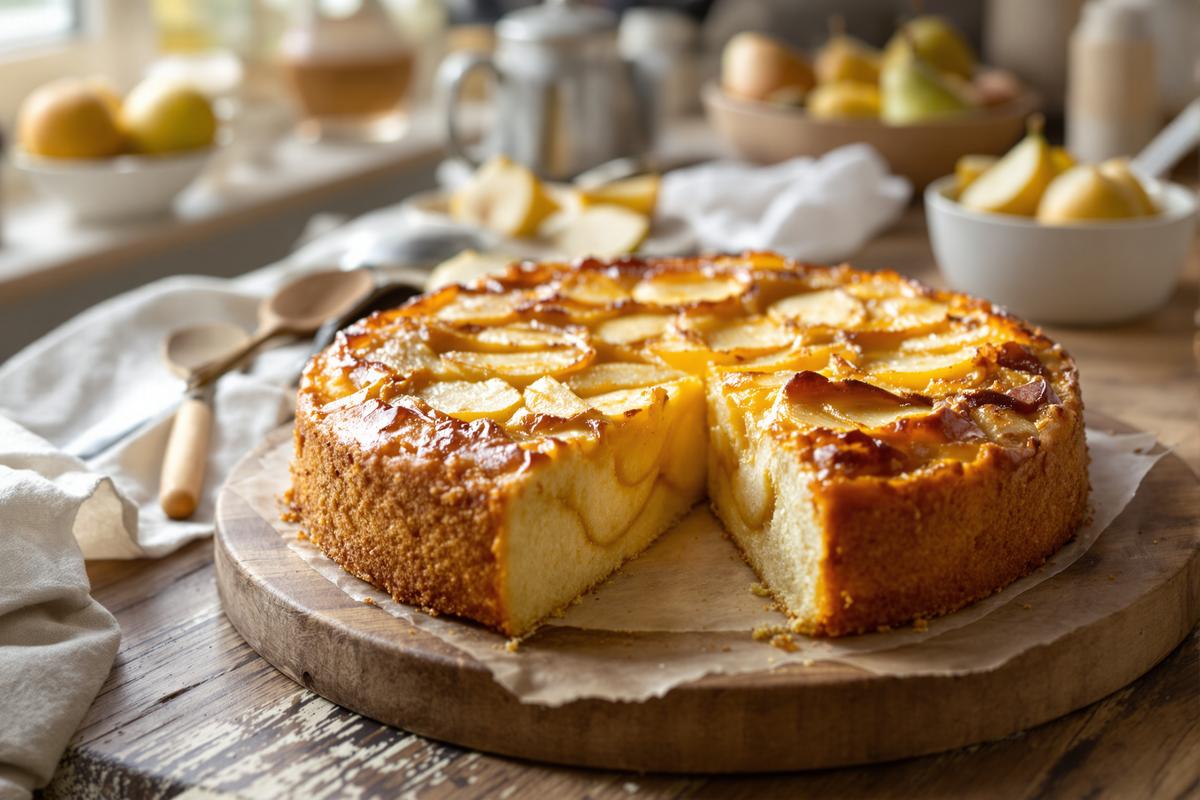 Ce gâteau pourrait presque passer inaperçu… jusqu’à la première bouchée. Sous sa surface dorée se cache une pâte légère, parfumée, enveloppant des poires juteuses. Ce contraste entre le fondant intérieur et la croûte légèrement caramélisée est irrésistible.