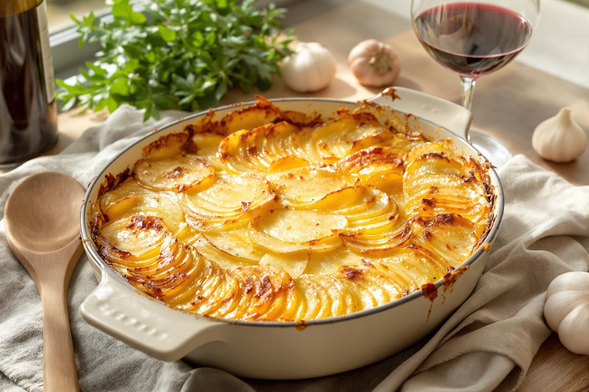 Contrairement au gratin dauphinois qui utilise crème et lait, cette recette mise sur un bouillon parfumé. Résultat : des pommes de terre fondantes, dorées à la surface, légères mais pleines de goût. Et pas de risque qu’elles « tombent » en purée.